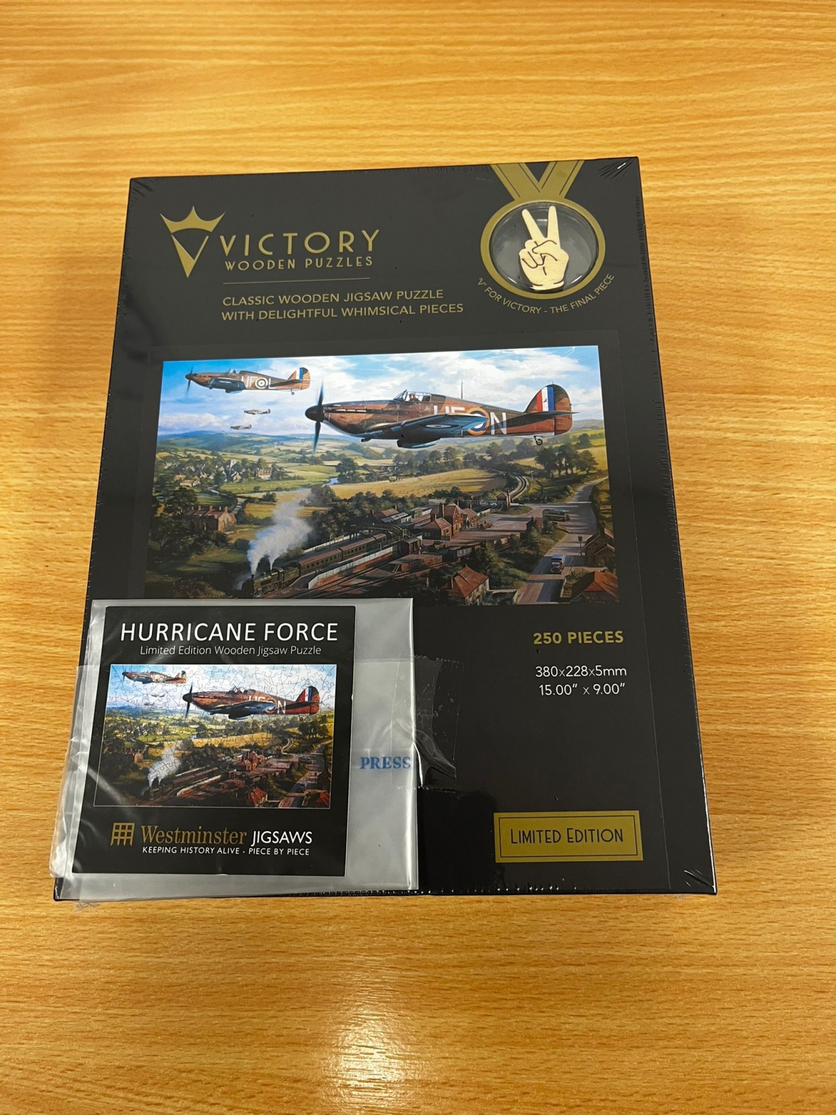 It also features some unusually shaped jigsaw pieces, including a 'V for Victory' sign as the final piece. There are 250 pieces to the jigsaw in total.