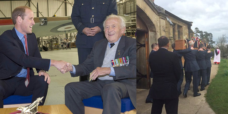 The BBMF pall bearers included three modern RAF and BBMF fighter pilots: Sqn Ldr Mark Discombe, Flt Lt Antony Parkinson MBE and Flt Lt Andy Preece. The bearer party also included WO Kev Ball, Cpl Mike Streather and SAC(T) Chris Lomas. The “Caller” was Flt Sgt Deano McAllister and Cpl Dan Nolan & SAC(T) Ian Taylor also assisted. The Prince of Wales, Patron of the Battle of Britain Fighter Association, and The Duchess of Cornwall were represented at the funeral by Air Chief Marshal Sir Michael Graydon (President of the Battle of Britain Memorial Fund and a former Chief of the Air Staff). Also in attendance were Gp Capt Jez Attridge (RAF Coningsby Station Commander and BBMF fighter pilot) and Air Cdre Johnny Stringer (former RAF Coningsby Station Commander and BBMF fighter pilot).